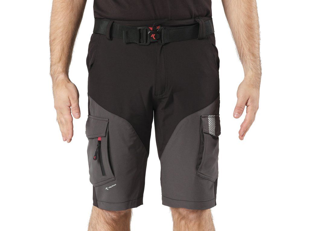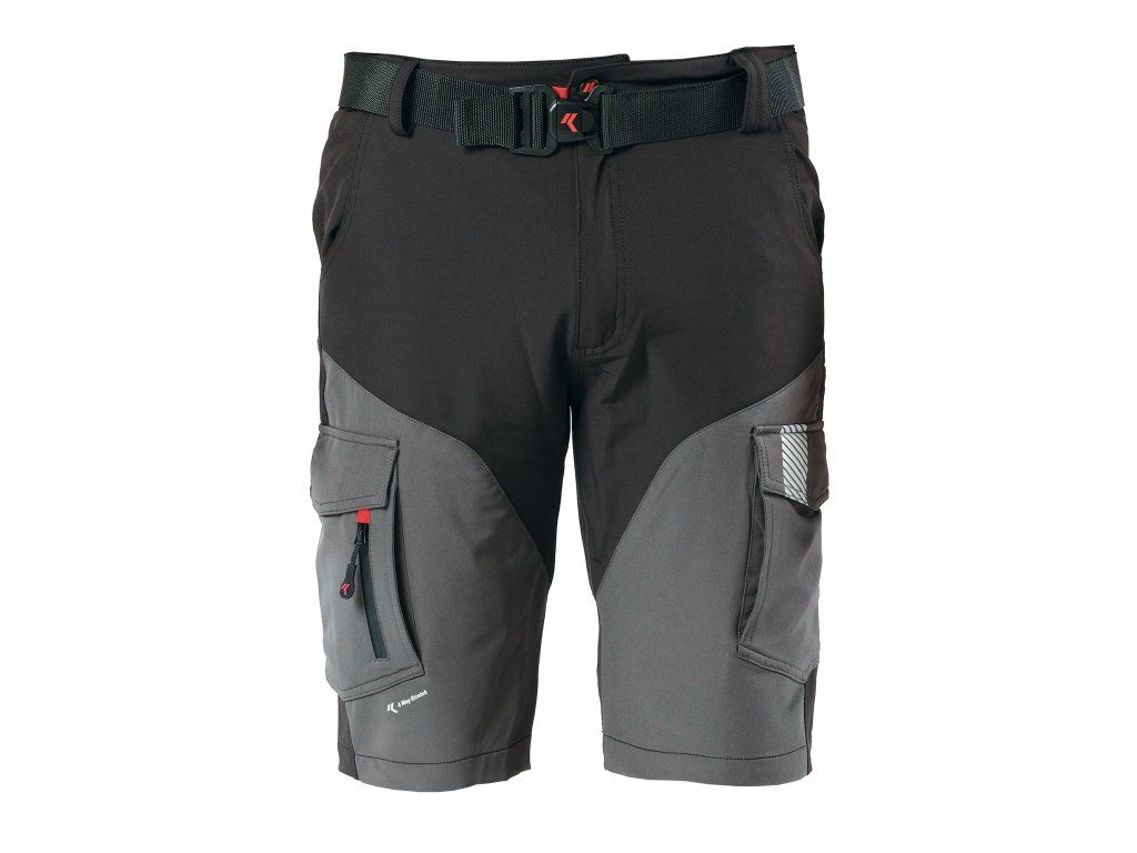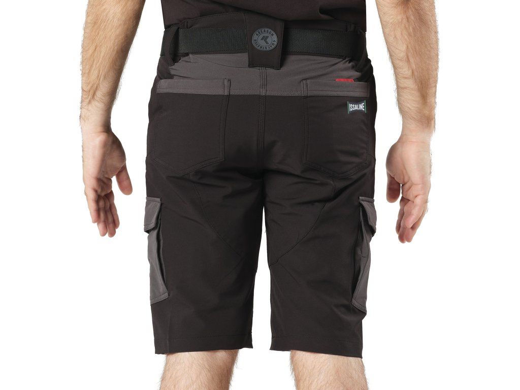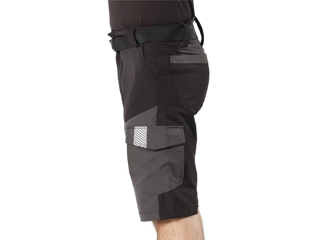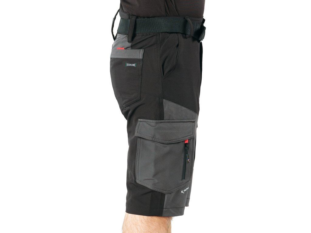 Šortky jsou navrženy pro funkčnost, zahrnují dvě přední kapsy, dvě zadní kapsy, levou kapsu na náklad s retroreflexními vložkami a malou kapsu na zip na pravé straně pro bezpečné uložení. Odnímatelné kapsy na nářadí zvyšují všestrannost podle provozních potřeb. Elastický pas v kombinaci s odnímatelným páskem zajišťuje bezpečné a nastavitelné usazení. Reflexní vložky zlepšují viditelnost za špatného osvětlení.